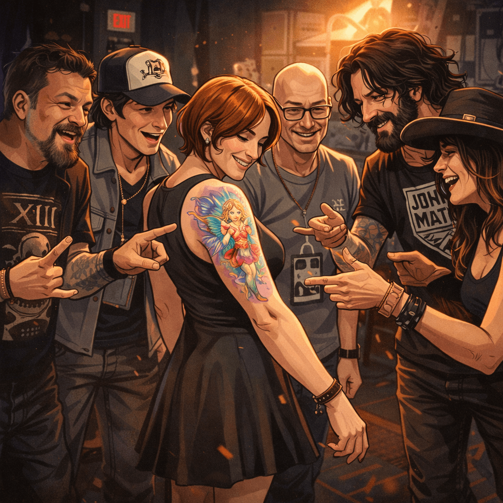 My wife was with me, and she was wearing something that—of course—people noticed. She has this incredible tattoo: a colorful fairy piece by Chris Blinston. It’s one of those tattoos that doesn’t sit quietly. It announces itself. Bright, bold, artful—like it belongs in a gallery and somehow also belongs in a rock show.