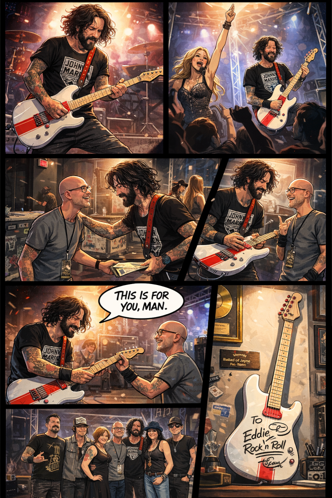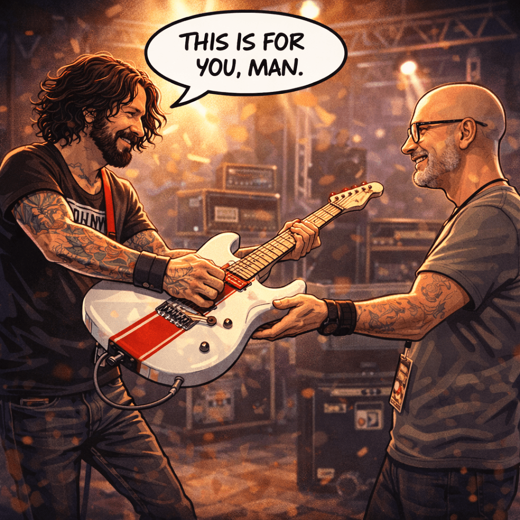Sometimes it’s a guitar handed to you backstage—like a benediction—so you can hang it up and remember that you made it through.