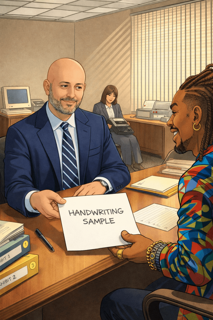 “Counsel,” he said, dry as legal dust, “that writing sample is now part of the record. It stays with the exhibits.”